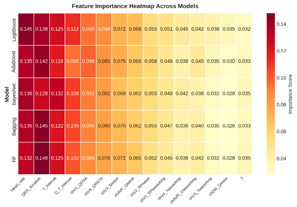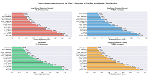 Fig 4 details the ranked importance of elite features across the four top-performing classifiers. The analysis reveals that core cardiac interval measures, heart rate, QRS duration, T interval, and Q-T interval, emerged as the most influential and consistent predictors across all algorithms. This cross-model consensus highlights these features as particularly robust, stable drivers of high predictive accuracy irrespective of the underlying model architecture.
